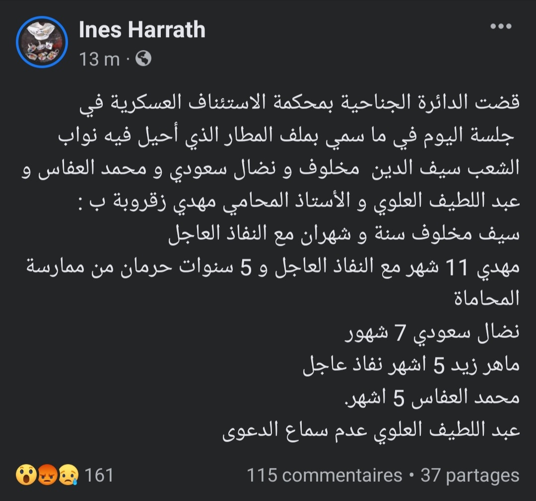 قضت الدائرة الجناحية بمحكمة الاستئناف العسكرية بأحكام بالسجن في حق المحالين في قضية المطار وهم النواب في البرلمان المنحل سيف الدين مخلوف ونضال سعودي ومحمد العفاس وعبد اللطيف العلوي والمحامي مهدي زقروبة.