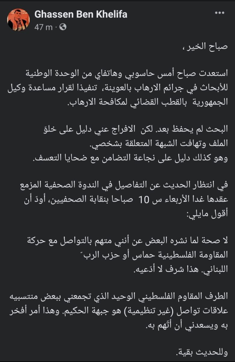 وأضاف بن خليفة، في أول تدوينة له بعد الإفراج عنه، أن البحث لم يحفظ بعد.