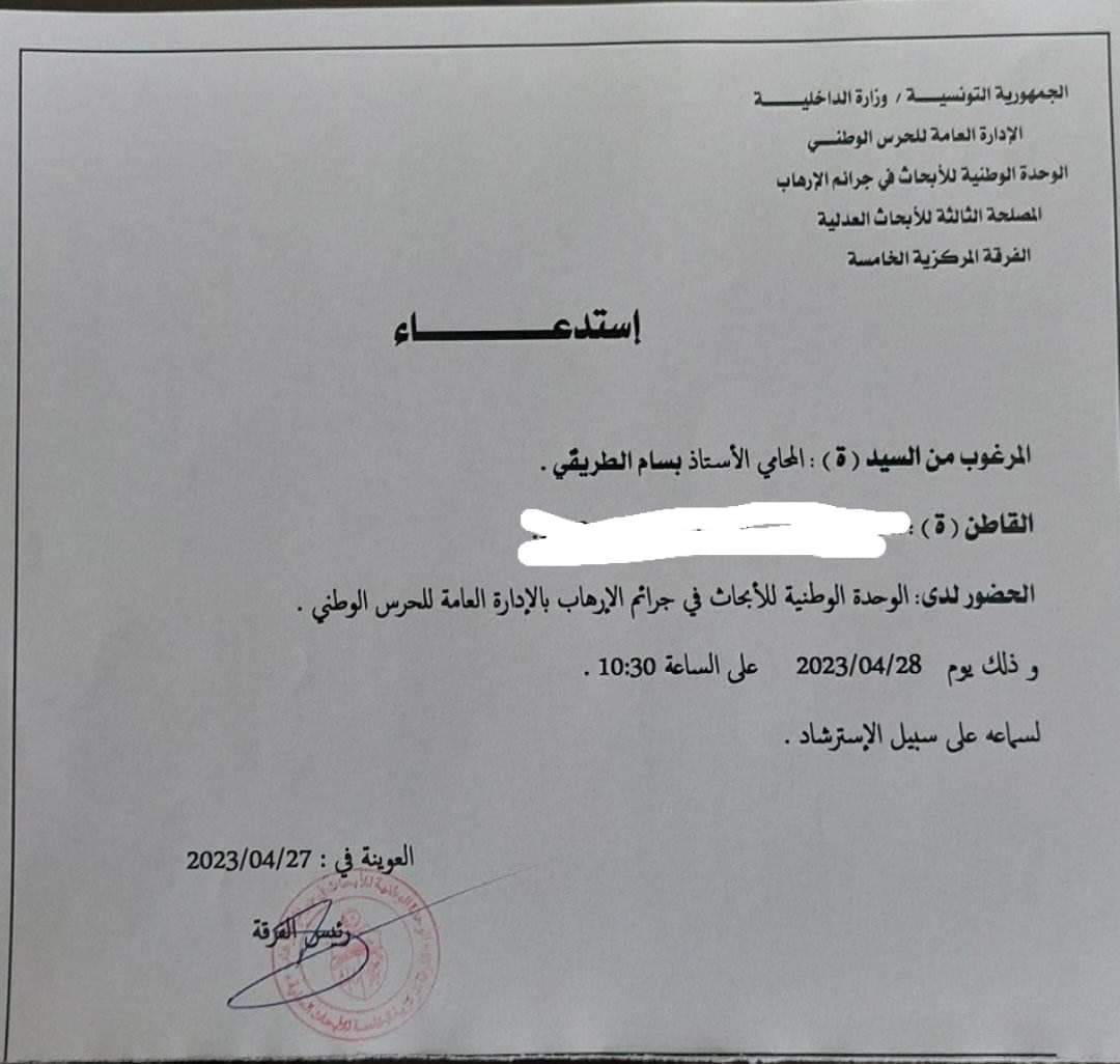 تم، اليوم الخميس، استدعاء رئيس الرابطة التونسية للدفاع عن حقوق الانسان والمحامي بسام الطريفي للمثول غدًا أمام الوحدة الوطنية للبحث في جرائم الإرهاب.