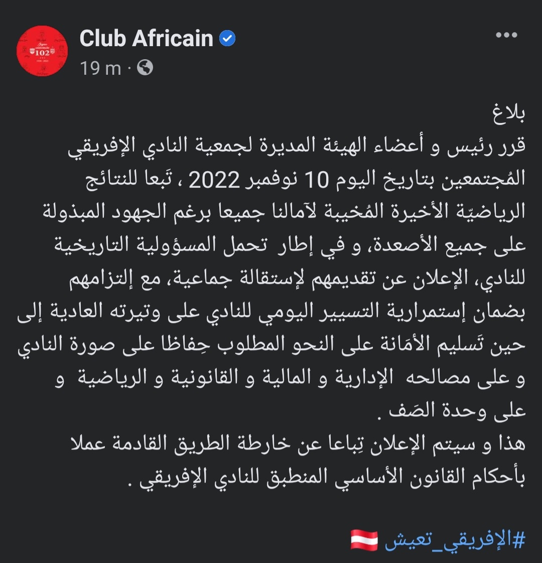 قرر رئيس الهيئة المديرة لجمعية النادي الإفريقي ومديرها، تقديم استقالة جماعية، "وذلك تَبعا للنتائج الرياضيّة الأخيرة المُخيبة لآمالنا جميعا برغم الجهود المبذولة على جميع الأصعدة" وفق نص البلاغ.