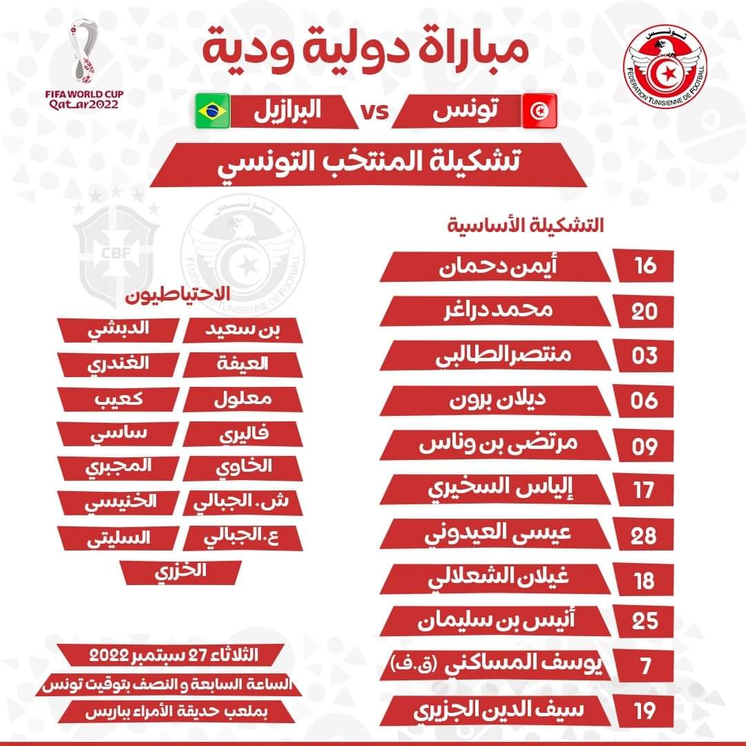 تدور مباراة البرازيل وتونس الودية التحضيرية لنهائيات كأس العالم "قطر 2022" في ملعب "حديقة الأمراء"، في باريس، اليوم الثلاثاء، بداية من الساعة السابعة والنصف بتوقيت تونس.