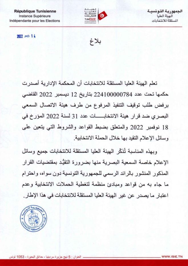 أفادت الهيئة العليا المستقلة للانتخابات، في بلاغ، بأنّ المحكمة الإدارية أصدرت قرارها فيما يتعلق بشكاية الهيئة العليا المستقلة للاتصال السمعي البصري.