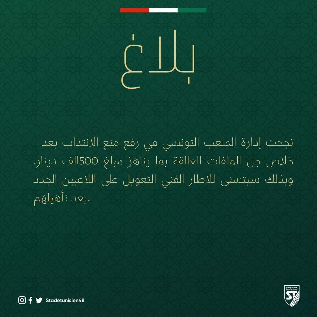أعلن الملعب التونسي عن إتمام كل إجراءات رفع عقوبة المنع من الانتداب بعد تسوية كل الخطايا التي تبلغ قيمتها 500 ألف دينار، وفق بيان ورد بصفحته الرسمية.