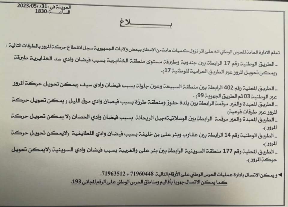أعلنت الإدارة العامة للحرس الوطني، في بلاغ، عن انقطاع حركة المرور بعدد من الطرقات إثر نزول كميات هامة من الأمطار.
