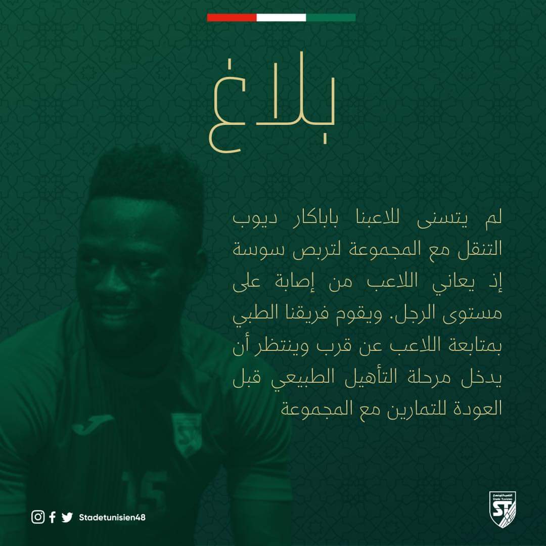 اعلن الملعب التونسي عن إصابة لاعبه الموريتاني باباكار ديوب على مستوى الرجل.