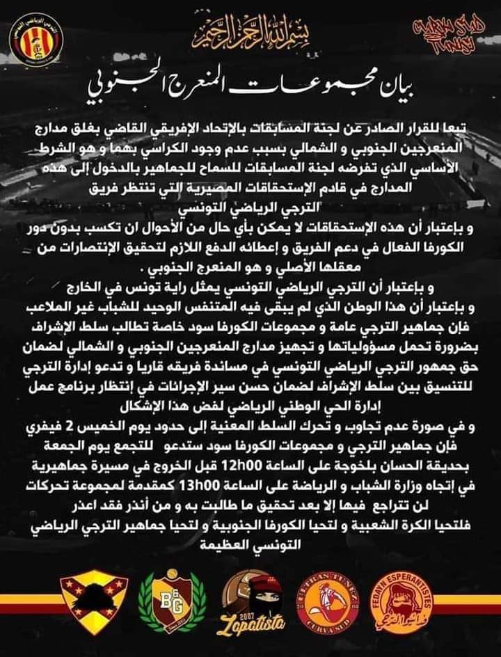 الصفحة الرئيسية رياضة بيان غاضب لمجموعات المنعرج الجنوبي للترجي