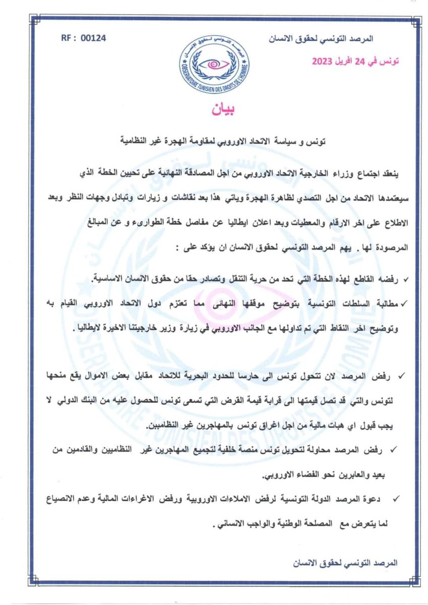 وطالب المرصد، في البيان ذاته، الحكومة التونسية بتحديد موقفها النهائي من سياسة الاتحاد الاوروبي المتعلقة بمقاومة الهجرة غير النظامية وخطته التي سيعتمدها من اجل التصدي لهذه الظاهرة معبرا عن رفضه القاطع لهذه الخطة التي قال انها تحد من حرية التنقل وتصادر حقا من حقوق الانسان الاساسية.