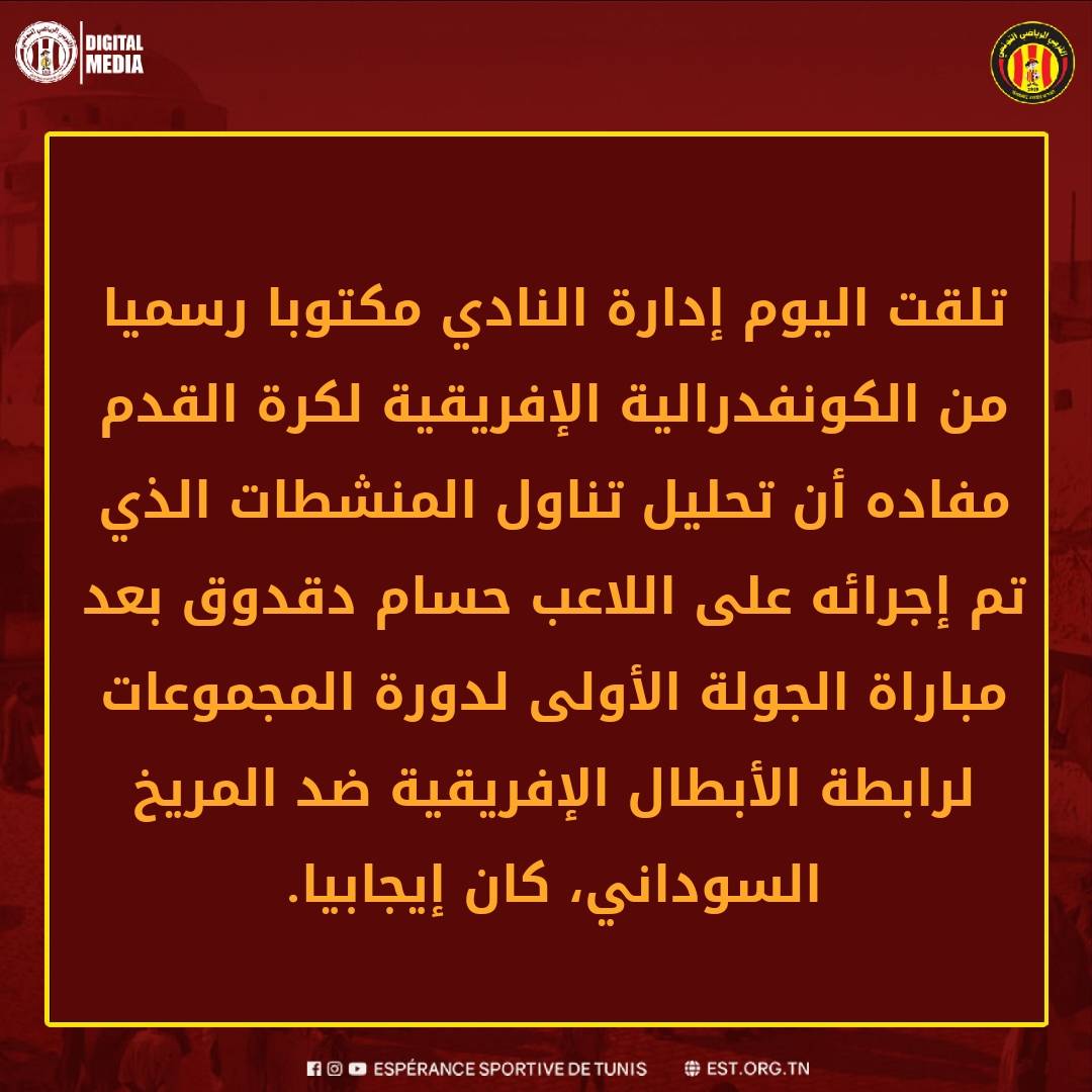 تلقت إدارة الترجي الرياضي التونسي مكتوبا رسميا من الكونفدرالية الإفريقية لكرة القدم يتضمن نتيجة تحليل تناول المنشطات الخاص باللاعب حسام دقدوق.