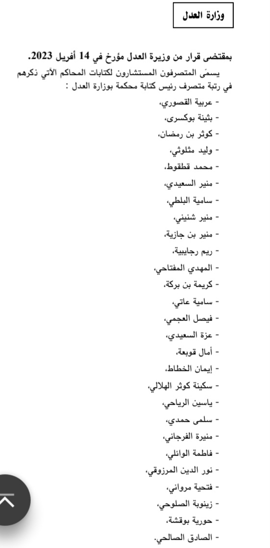 صدرت بالرائد الرسمي للجمهورية التونسية بتاريخ 14 أفريل 2023 تسميات في رتبة متصرف رئيس كتابة محكمة بوزارة العدل.