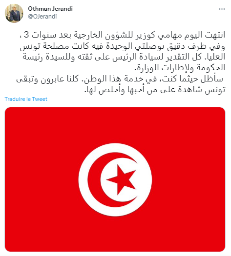 إثر إعفائه من مهامه على رأس وزارة الشؤون الخارجيّة والهجرة والتونسيين بالخارج، نشر عثمان الجرندي تغريدة على حسابه بتويتر.