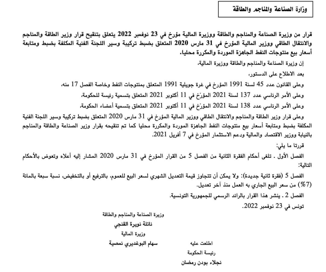 صدر، اليوم، بالرائد الرسمي للجمهورية التونسية قرار من وزيرة الصناعة والمناجم والطاقة ووزيرة المالية مؤرخ في 23 نوفمبر 2022 يتعلق بتنقيح قرار وزير الطاقة والمناجم والانتقال الطاقي ووزير المالية المؤرخ في 31 مارس 2020 المتعلق بضبط تركيبة وسير اللجنة الفنية المكلفة بضبط ومتابعة أسعار بيع منتوجات النفط الجاهزة الموردة والمكررة محليا.