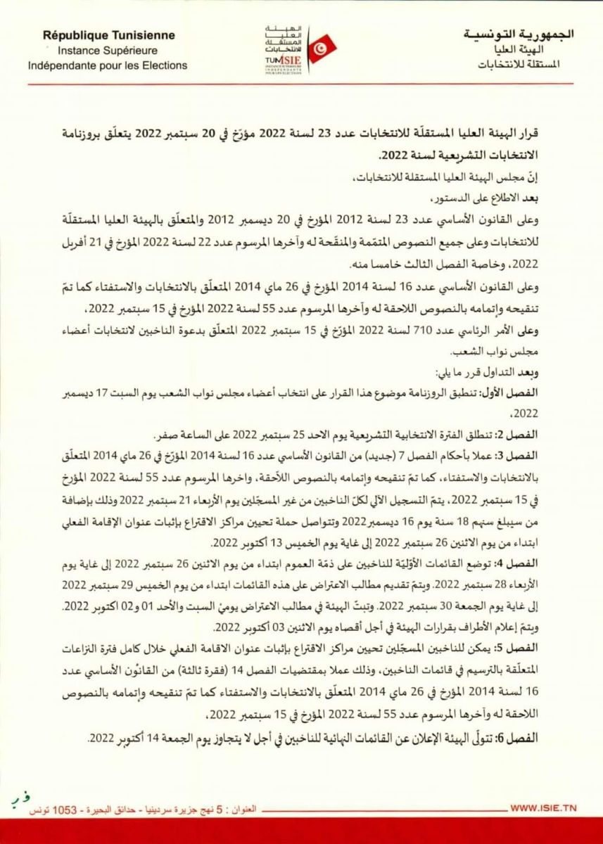 نشرت الهيئة العليا المستقلة للانتخابات روزنامة الانتخابات التشريعية التي من المزمع تنظيمها يوم 17 ديسمبر داخل تونس وأيام 15و 16و17 ديسمبر في الخارج