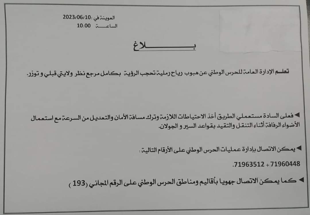 أعلنت الإدارة العامة للحرس الوطني، في بلاغ، عن هبوب رياح رملية تحجب الرؤية بكامل مرجع نظر ولايتي قبلي وتوزر.