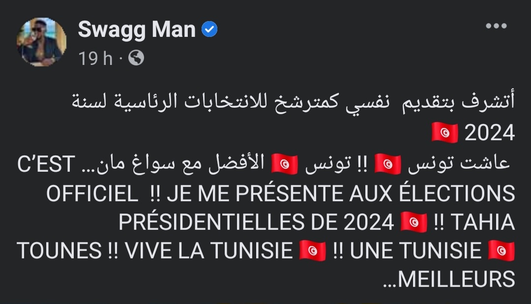 أعلن مغني الراب عتاب زعيبط المعروف بـ"سواغ مان" عن ترشحه للانتخابات الرئاسية 2024.