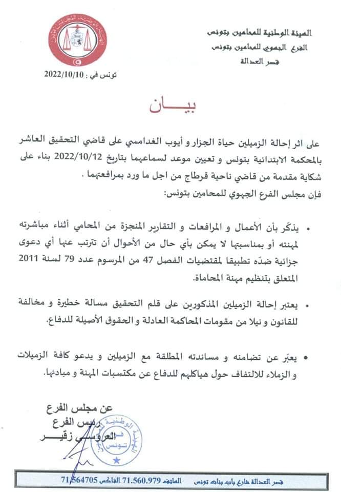 أصدر الفرع الجهوي للمحامين بتونس بيانا بخصوص إحالة المحاميين حياة الجزار و أيوب الغدامسي على قاضي التحقيق العاشر بالمحكمة الابتدائية بتونس و تعيين موعد لسماعهما بتاريخ 2022/10/12.