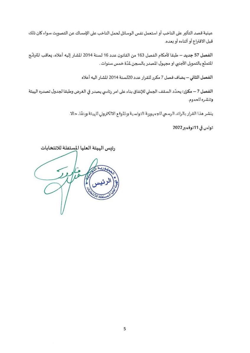 نشرت الهيئة العليا المستقلة للانتخابات قرارها عدد 30 المؤرخ في 11 نوفمبر 2022 حول تنقيح وإتمام القرار عدد 20 لسنة 2014، ويتعلق بضبط قواعد تمويل الحملة الانتخابية وإجراءاته وطرقه.