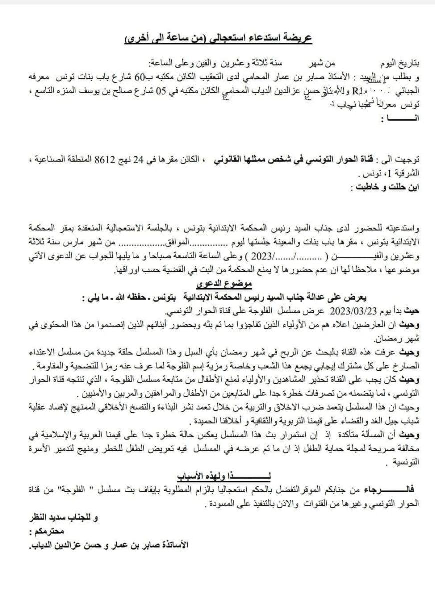 تقدم المحاميان صابر بن عمار وحسن عز الدين الدياب بقضية استعجالية لإيقاف بث مسلسل "الفلوجة" الذي يعرض على قناة الحوار التونسي بمناسبة شهر رمضان.