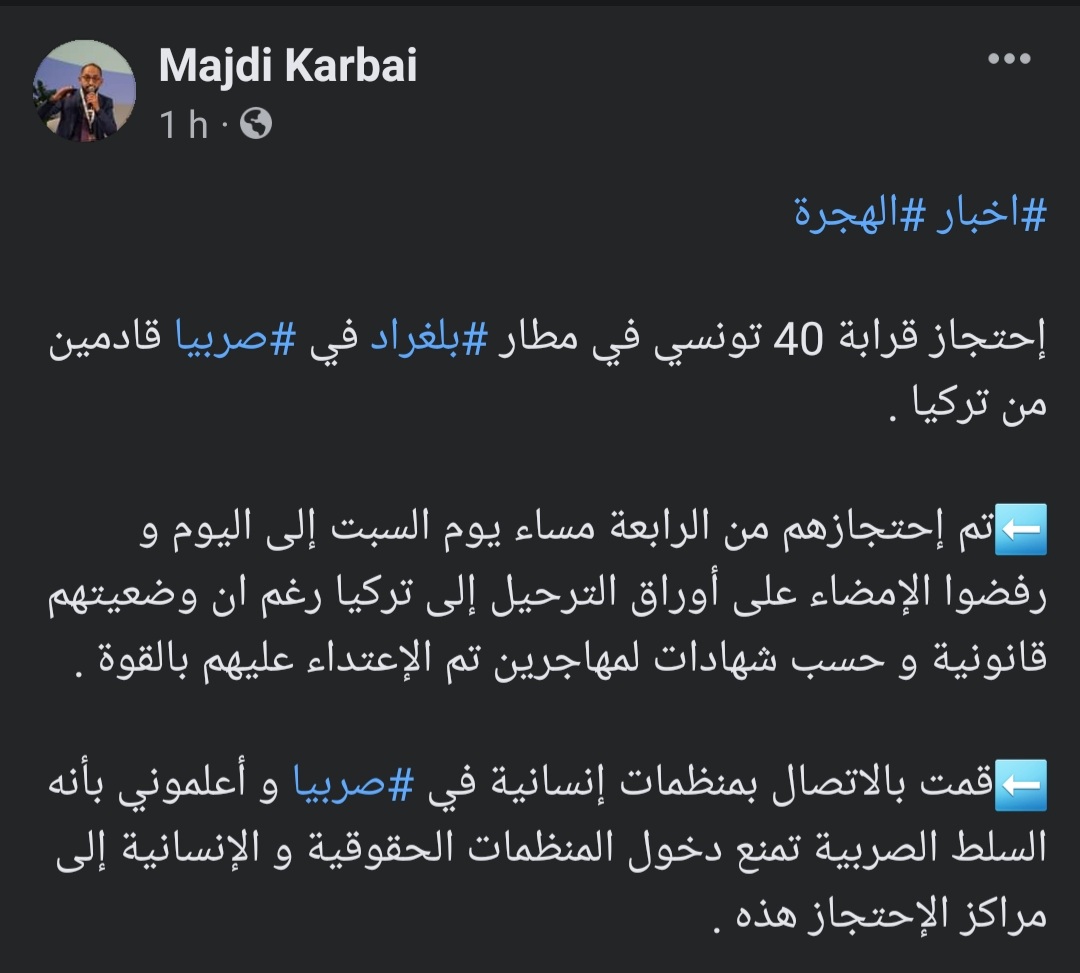 الصفحة الرئيسية مجتمع مجدي الكرباعي:  احتجاز قرابة 40 تونسيا في صربيا