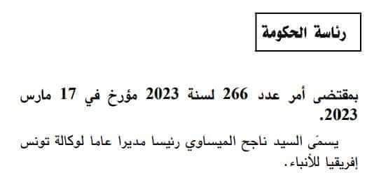تمت تسمية الصحفي ناجح الميساوي رئيسا مديرا عاما لوكالة تونس إفريقيا للأنباء بمقتضى أمر صدر بالرائد الرسمي.
