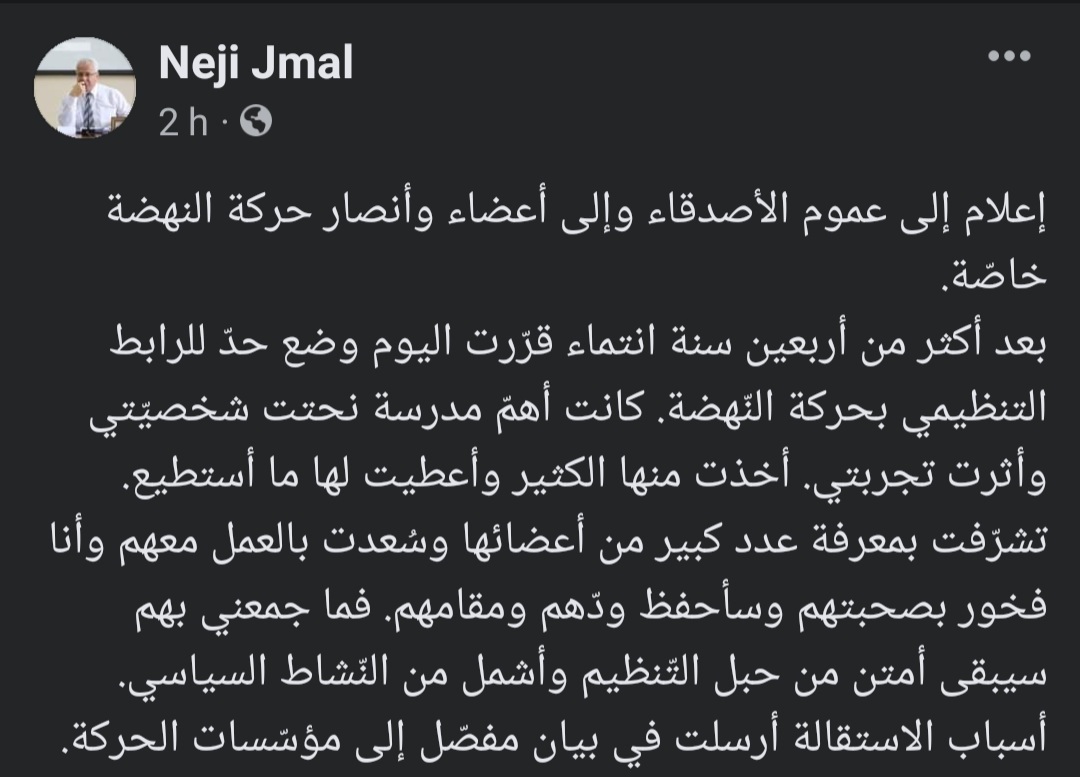 أعلن، اليوم، القيادي في حركة النهضة والنائب السابق بالبرلمان، ناجي الجمل استقالته من حركة النهضة.