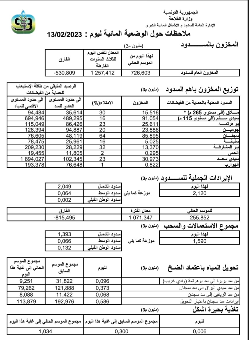 بلغت نسبة امتلاء السدود اليوم الاثنين 13 فيفري 2023 إثر تهاطل الأمطار الأخيرة 31.3 %، وفق معطيات خاصة بوضعية السدود نشرها المرصد الوطني للفلاحة.