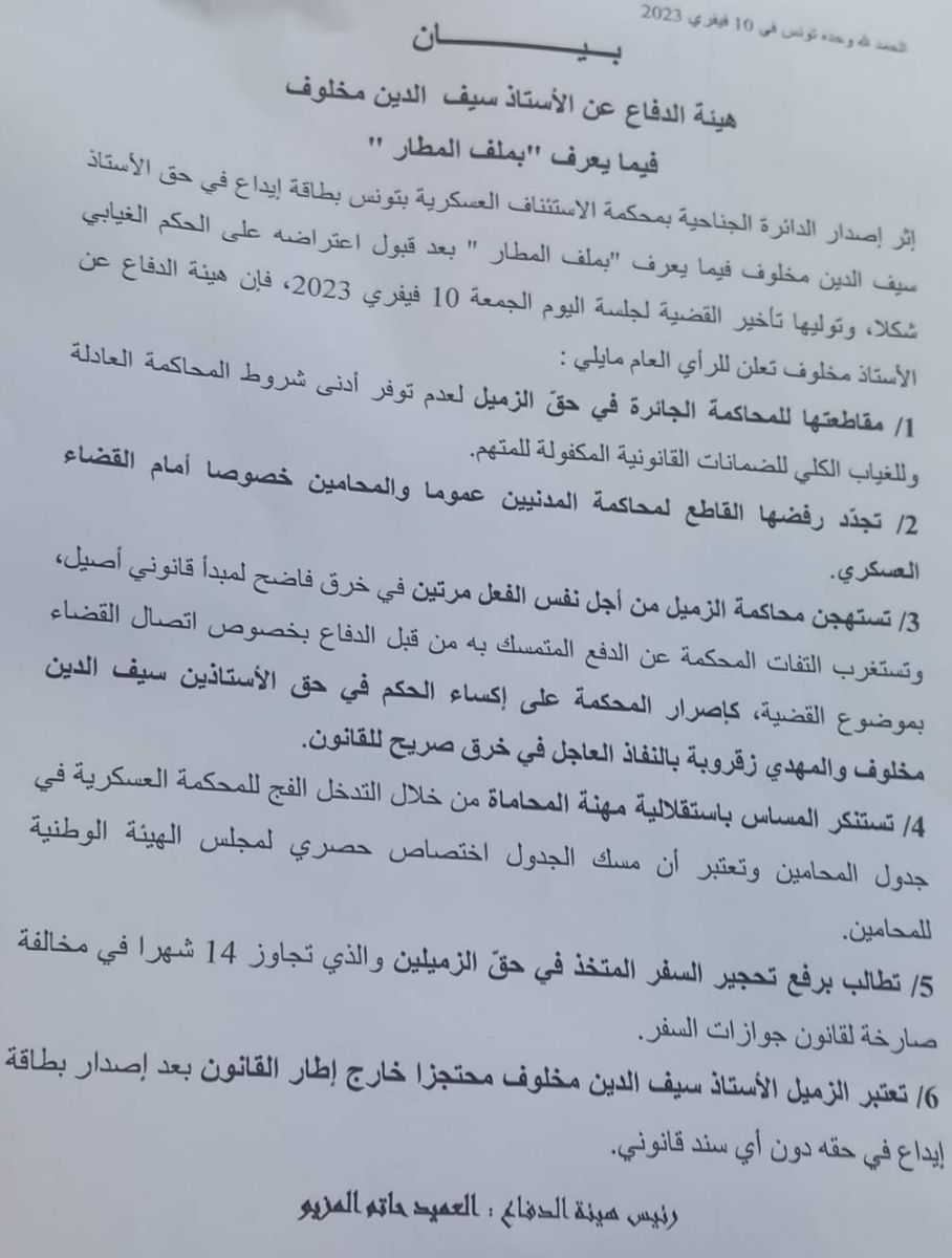 أعلنت هيئة الدفاع عن المحامي والنائب في البرلمان المنحل سيف الدين مخلوف عن مقاطعتها لمحاكمته لعدم توفر أدنى شروط المحاكمة العادلة وللغياب الكلي للضمانات القانونية المكفولة للمتهم، وفق ما ورد في بيان للهيئة.