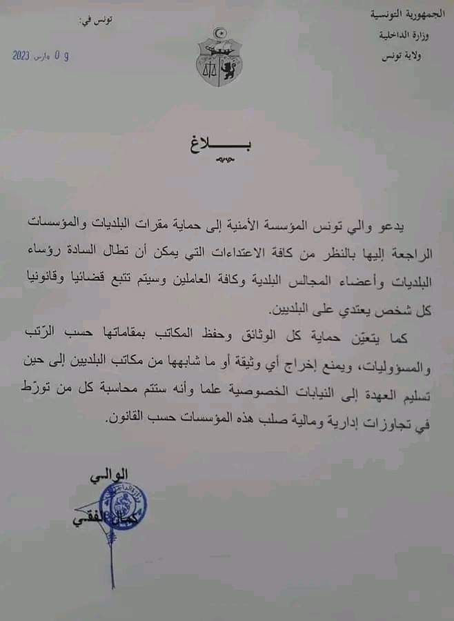 الصفحة الرئيسية سياسة والي تونس يدعو المؤسّسة الأمنية إلى حماية مقرات البلديات