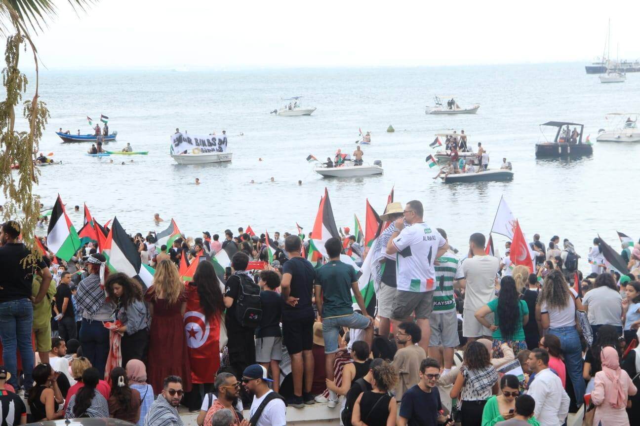 خلال الاستعداد لانطلاق أسطول الصمود، تحول شاطئ سيدي بوسعيد، رغم حساسية موقعه لملاصقته لمباني سيادية، إلى ساحة تضامن كبرى حيث احتشد الاف التونسيين في مشهد جماهيري مؤثر رفعوا فيه الأعلام الفلسطينية ورددوا شعارات تطالب بكسر الحصار على غزة وتدين الاحتلال، أكد عمق ارتباط الشارع التونسي بالقضية الفلسطينية ومنح الأسطول زخما سياسيا وإعلاميا جعل من تونس منصة مركزية لصوت العدالة والحرية في المنطقة.