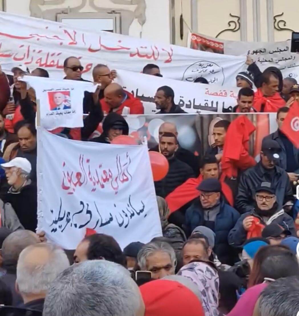 ورفع المشاركون عدداً من اللافتات وردّدوا شعارات عبّروا من خلالها عن رفضهم لما وصفوه بالتدخل الأجنبي في الشأن الداخلي التونسي، إضافة إلى المطالبة بالمحاسبة، من بينها شعار: “الشعب يريد قيس من جديد”.