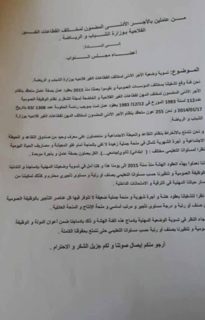 طالب العاملون بالأجر الأدنى المضمون لمختلف القطاعات غير الفلاحية بوزارة الشباب، في مراسلة وجهوها إلى أعضاء مجلس نواب الشعب، بتسوية وضعيتهم.