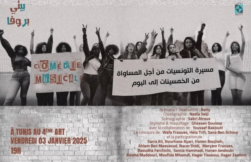 “بروفا في بيتي” تعبيرة فنية تستحصر من خلالها جمعية “بيتي” نضالات التونسيات من أجل الحقوق والمساواة وهي تتخذ شكل الكوميديا الموسيقية، وفق ما أوردته الجمعية.