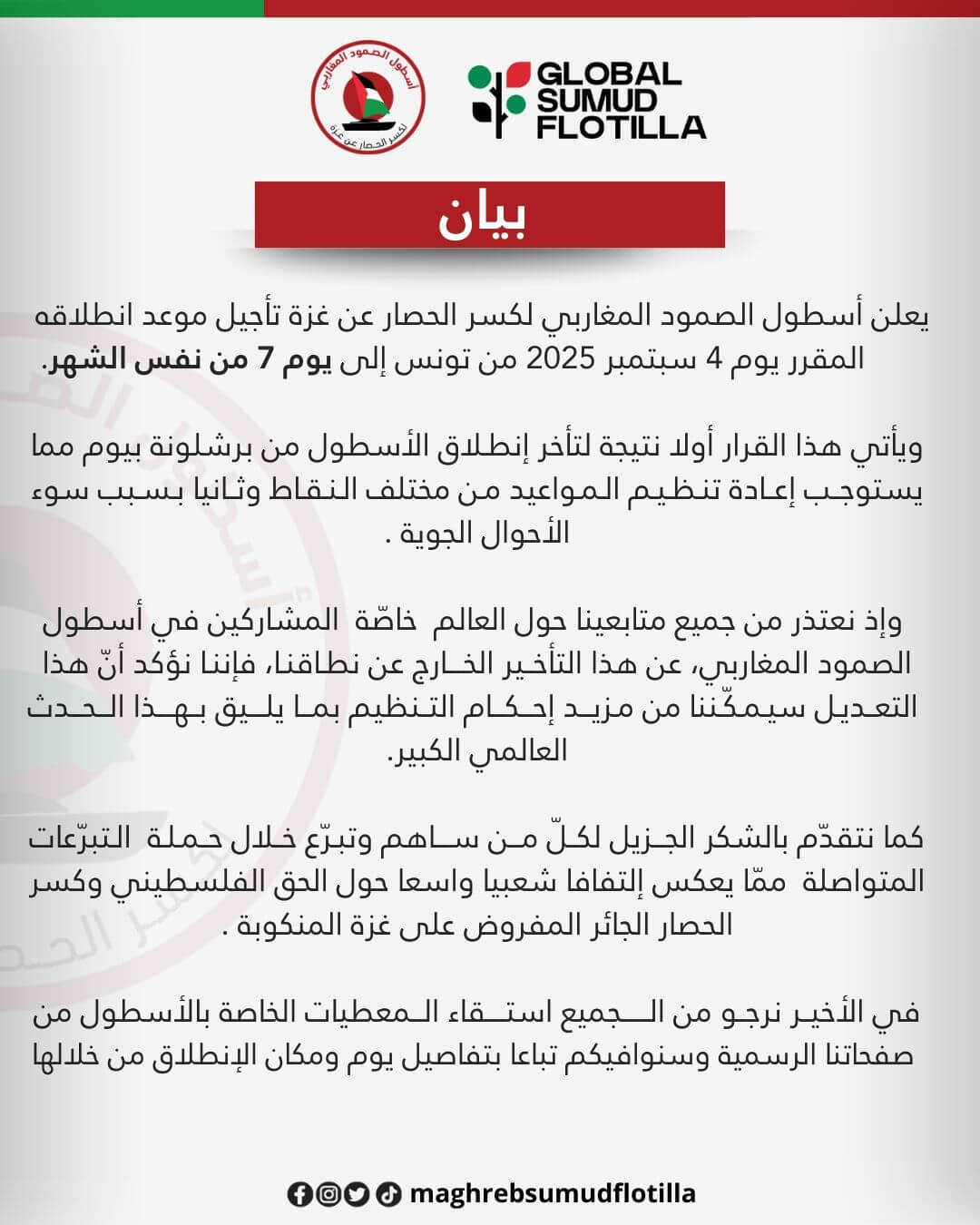 أعلن أسطول الصمود المغاربي لكسر الحصار على غزة، عن تأجيل موعد انطلاقه من تونس، الذي كان مبرمجا ليوم 4 سبتمبر 2025، إلى يوم 7 من الشهر نفسه.