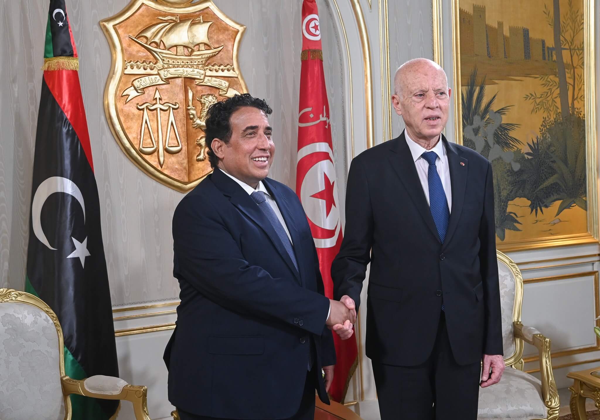 وعقب ذلك، أجرى رئيس الدولة مباحثات بقصر قرطاج مع المنفي، جرى خلالها التأكيد على متانة العلاقات التاريخية بين تونس وليبيا، والحرص المشترك على دعمها وتطويرها في مختلف المجالات بما يخدم مصلحة الشعبين ويعزز الأمن والاستقرار والتنمية. وأكد سعيّد أنّ أمن تونس واستقرارها من أمن ليبيا واستقرارها، والعكس صحيح، مشددا على أن التحديات المشتركة تستوجب مجابهتها معا.