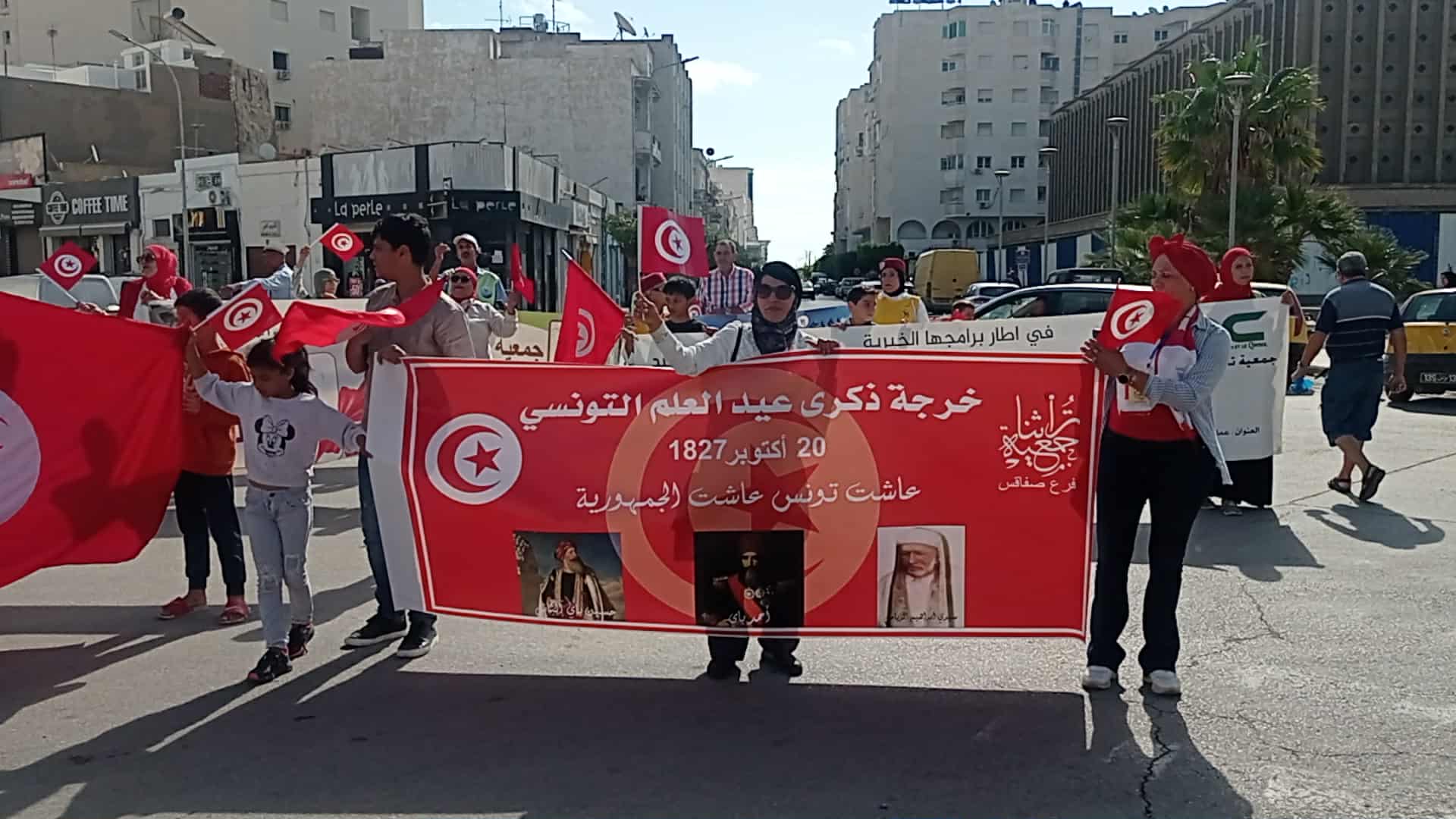 وقد انطلقت “خرجة العلم” من أمام” كشك الموسيقى ” بباب بحر وصولا إلى ساحة المقاومة بمدينة صفاقس رافعين الراية الوطنية .