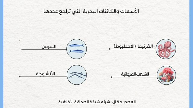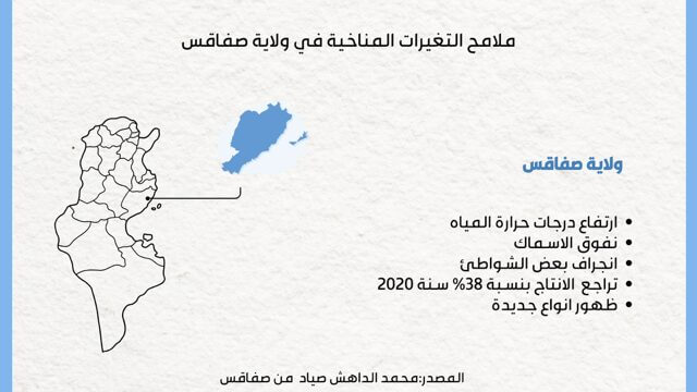 ثانيا، نقص التيارات البحرية المرتبطة بدورها بالتغيرات ونقص الرياح السطحية التي تتسبب في تراجع وفرة الأسماك فبعضها قد يختفي من مناطق تواجده المعتادة وهذا يصعب على الصياد التقليدي تحديد أماكن الصيد. وتأكيدا لذلك يقول محمد (32 سنة) وهو صياد من ولاية صفاقس:” من اغرب الظواهر التي نشهدها الان وتدل بوضوح على التأثير الشديد للتغيرات المناخية على تركيبة الحياة البحرية هي تواجد القرنيط (الاخطبوط) الان في أشهر الصيف بأعداد كبيرة جدا اي خارج موسمه وهذا ينطبق على معظم أنواع الأسماك التي نصطادها عادة، أي ان التغيرات المناخية تسببت في تغير مواسم التكاثر وهذا نتج عنه تغير مواسم الصيد.”