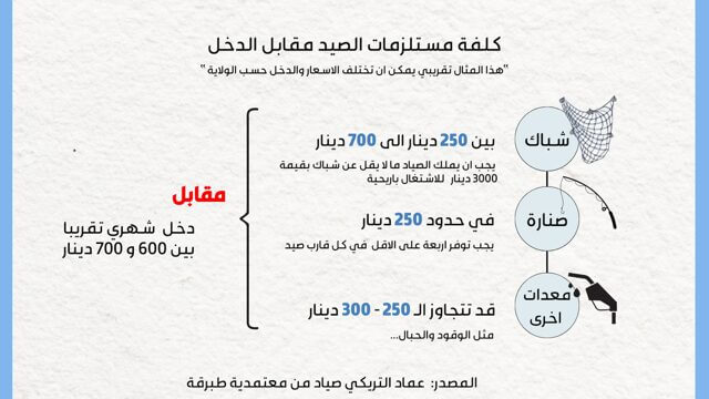 ويضيف محدثنا ان في طبرقة مثلا، يخرج الصيادون بين 120 الى 150 رحلة صيد في السنة بالتالي نصف السنة تقريبا يكون للصياد عمل يسترزق منه، أما خلال النصف الثاني من السنة فيظل عاطل عن العمل. ويبلغ معدل دخل الصياد بين 600 و700 دينار شهريا في حال كانت الظروف مناسبة ويمكن ان تكون الخسارة مائة بالمائة أحيانا بسبب التغيرات المناخية الحادة وتراجع عدد الأسماك.