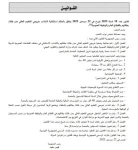 صدر بالعدد الأخير من الرائد الرسمي للجمهورية التونسية القانون عدد 18 لسنة 2025 المؤرّخ في 22 ديسمبر 2025، والمتعلّق بإقرار أحكام استثنائية لانتداب خريجي التعليم العالي الذين طالت بطالتهم، وذلك في القطاع العام والوظيفة العمومية.