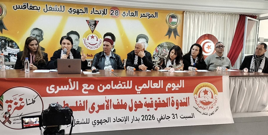 نظم الاتحاد الجهوي للشغل بصفاقس، اليوم السبت 31 جانفي 2026، ندوة حقوقية حول ملف الأسرى الفلسطينيين،بمقر الاتحاد الجهوي للشغل بصفاقس وذلك تزامنا مع احياء اليوم العالمي للتضامن مع الأسرى الفلسطينيين .