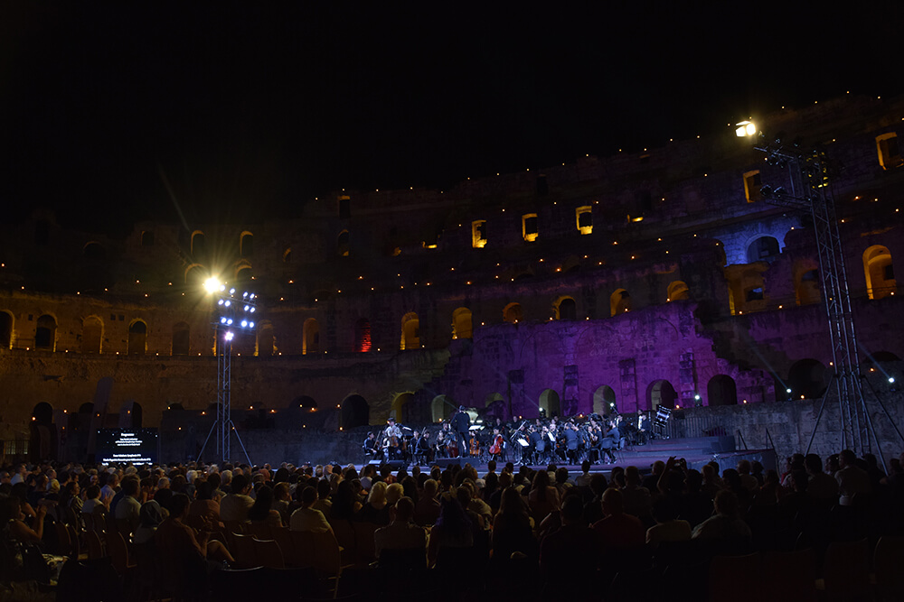 اذا انفلتت الأضواء الناعمة من أعمدة ومدارج ثالث “كُولُوسِّيُومْ” في العالم لتحتضن سيدة الليل: الموسيقى السمفونية في “ليلة عمر “فاعلم ان الموعد استثنائي ..انها سهرة اختتام الدورة 38من المهرجان الدولي للموسيقى السمفونية بالجم والتي دارت فعالياتها أمس السبت 16أوت 2025 بالتعاون مع سفارة النمسا بتونس وبتوقيع الأوركسترا السمفوني التونسي بقيادة المايسترو شادي الڨرفي ومشاركة هامة لعازف الكمان النمساوي يوري ريفتش.