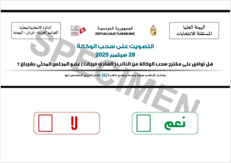 نشرت الهيئة العليا المستقلة للإنتخابات اليوم السبت على صفحتها الرسمية، نموذج ورقة التصويت على سحب الوكالة من أحد أعضاء المجلس المحلي بالدائرة الانتخابية القواسم الغربية بمعتمدية شربان من ولاية المهدية، الذي سينتظم يوم الأحد 28 سبتمبر الجاري من الساعة الثامنة صباحا إلى الساعة السادسة مساء.