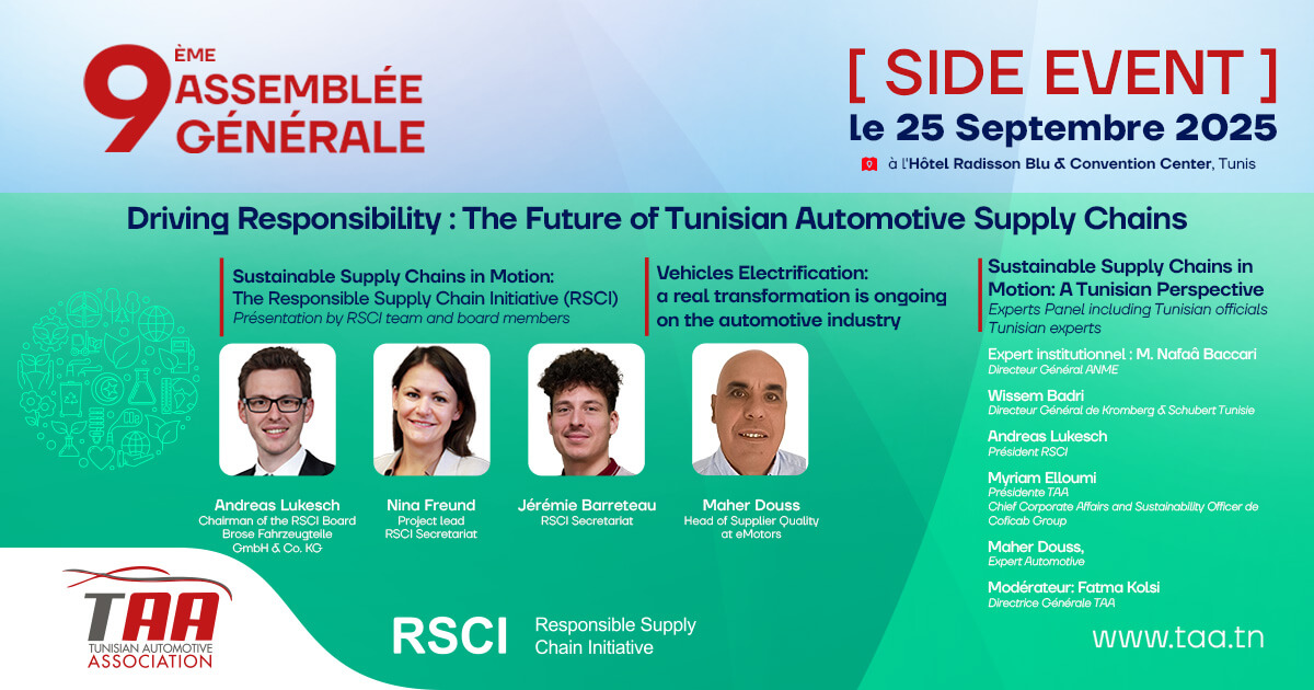 Au cœur de cette édition, les membres et partenaires de la TAA partageront les réalisations marquantes de l’association et de ses adhérents, ainsi que les activités et les perspectives d’évolution en cours et à venir. La journée se poursuivra avec un side-event intitulé “Driving Responsibility: The Future of Tunisian Automotive Supply Chains”, organisé en collaboration avec The Responsible Supply Chain Initiative (RSCI), qui mettra en avant les défis et opportunités liés aux chaînes d’approvisionnement responsables, un sujet clé pour la compétitivité durable de la filière automobile tunisienne.