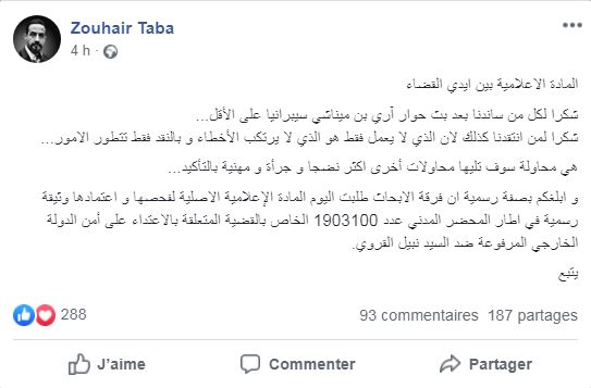 Dans un post publié sur sa page officielle Facebook, le journaliste tunisien installé au Canada Zouheir Taba, ayant été à l’origine de l’interview du lobbyiste israélien et patron de l’agence canadienne Dickens & Madson Ari Ben-Menashe diffusée sur les réseaux sociaux hier jeudi 10 octobre 2019, a affirmé que la copie originale de l’Interview a été officiellement mise à la disposition de la justice.