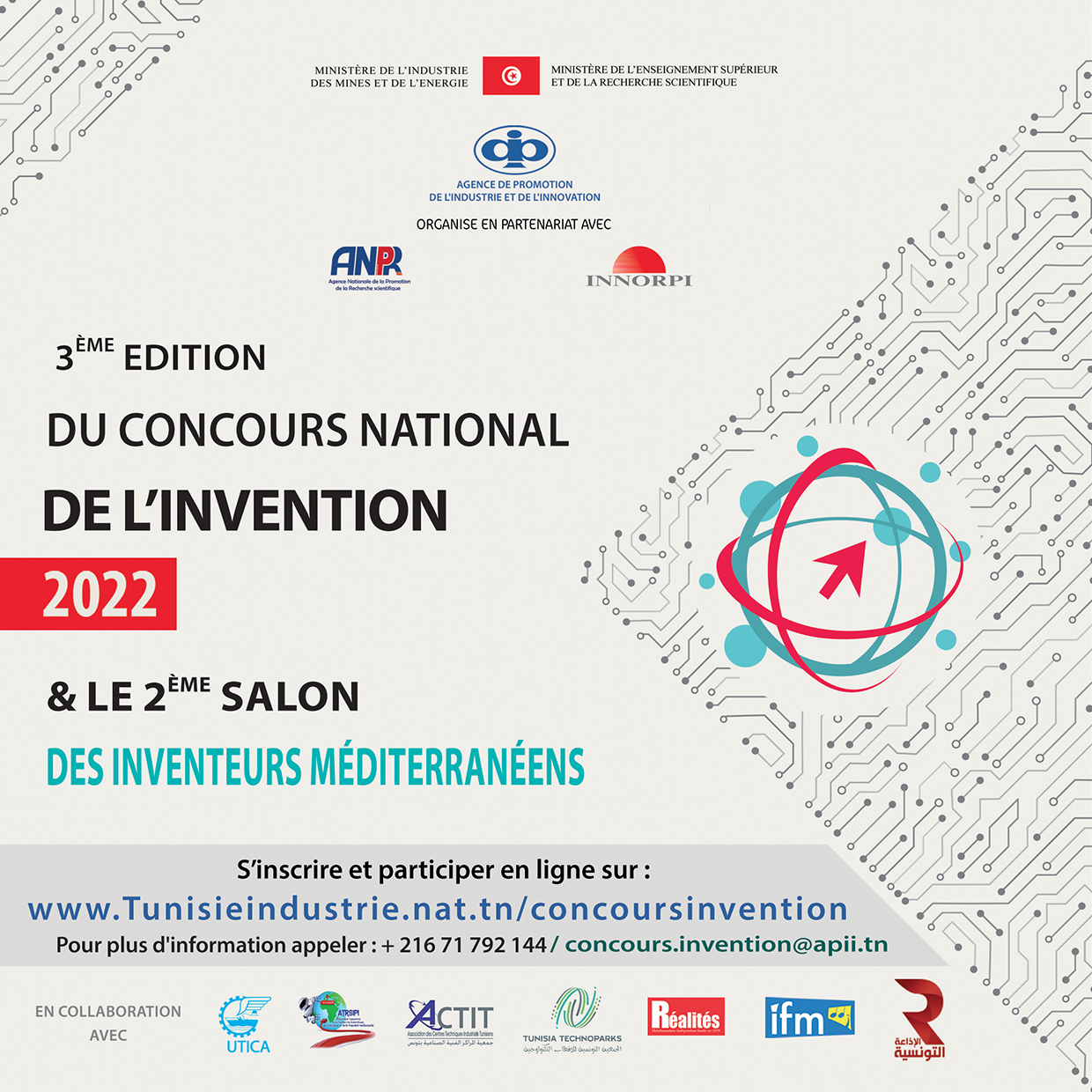 L’Agence de Promotion de l’Industrie et de l’Innovation (APII) organise, sous l’égide du Ministère de l’Industrie de l’Energie et des Mines, en partenariat avec l’Institut National de la Normalisation et de la Propriété Industrielle (INNORPI), l’Agence Nationale de la Promotion et de la Recherche Scientifique (ANPR) et l’Association Tunisienne de la Recherche Scientifique et l’innovation et la Propriété Intellectuelle (ATRSIPI), en collaboration avec le Ministère de l’Enseignement Supérieur et de la Recherche Scientifique (MESRS)) et en coordination avec l’Union Tunisienne de l‘Industrie, du Commerce et de l‘Artisanat (UTICA) la 3ème édition du Concours National de l’Invention et la 2ème Edition du Salon des Inventeurs Méditerranéens 2021 – 2022.