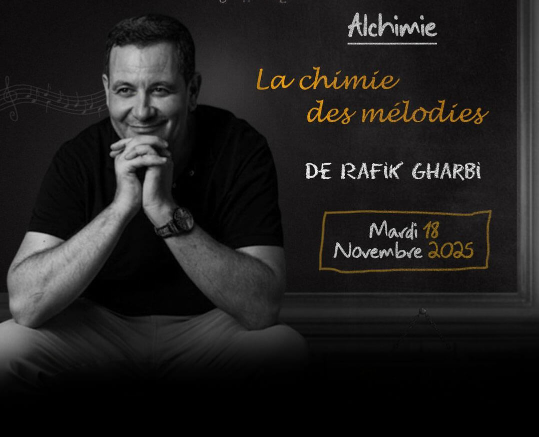 C’est de cette fusion entre science et musique qu’est né son projet « Alchimie », une exploration poétique et sonore des correspondances entre éléments, émotions et notes. Une partie de ce projet a déjà été présentée sur de prestigieuses scènes en Tunisie et à l’étranger, séduisant le public par sa profondeur, son audace et sa capacité à émouvoir. Avec « La chimie des mélodies », Rafik Gharbi poursuit sa quête de transcender la musique, en créant un pont entre la science, l’art et l’expérience émotionnelle de chacun.