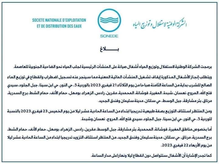 La reprise de l’approvisionnement sera progressivement, à partir de jeudi 23 février 2023 à 23h à El Wardia 5, Cité Ennour, Cité Ibn Sina, Djebel Jloud, Sidi Fathallah, El Mourouj, Nâassane et Chbedda, a noté la SONEDE dans son communiqué.