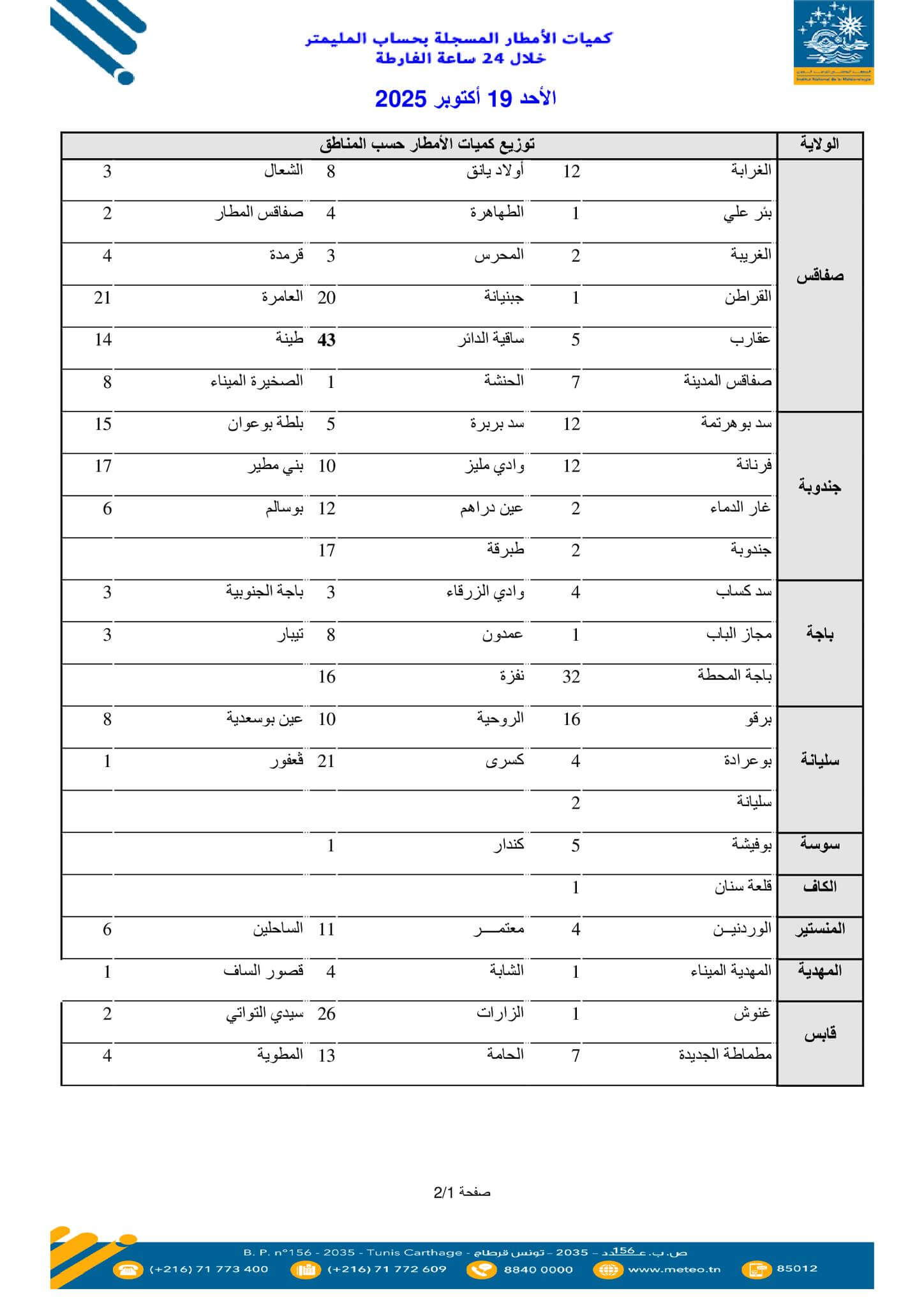 Selon les données publiées par l’INM, la plus forte quantité de pluie a été mesurée à El Alia avec 60 millimètres, suivie de : 55 mm à El Azib (Bizerte), 54 mm à Mateur (Bizerte), 51 mm à Tinja (Bizerte) et 43 mm à Sakiet Eddaïer (Sfax)