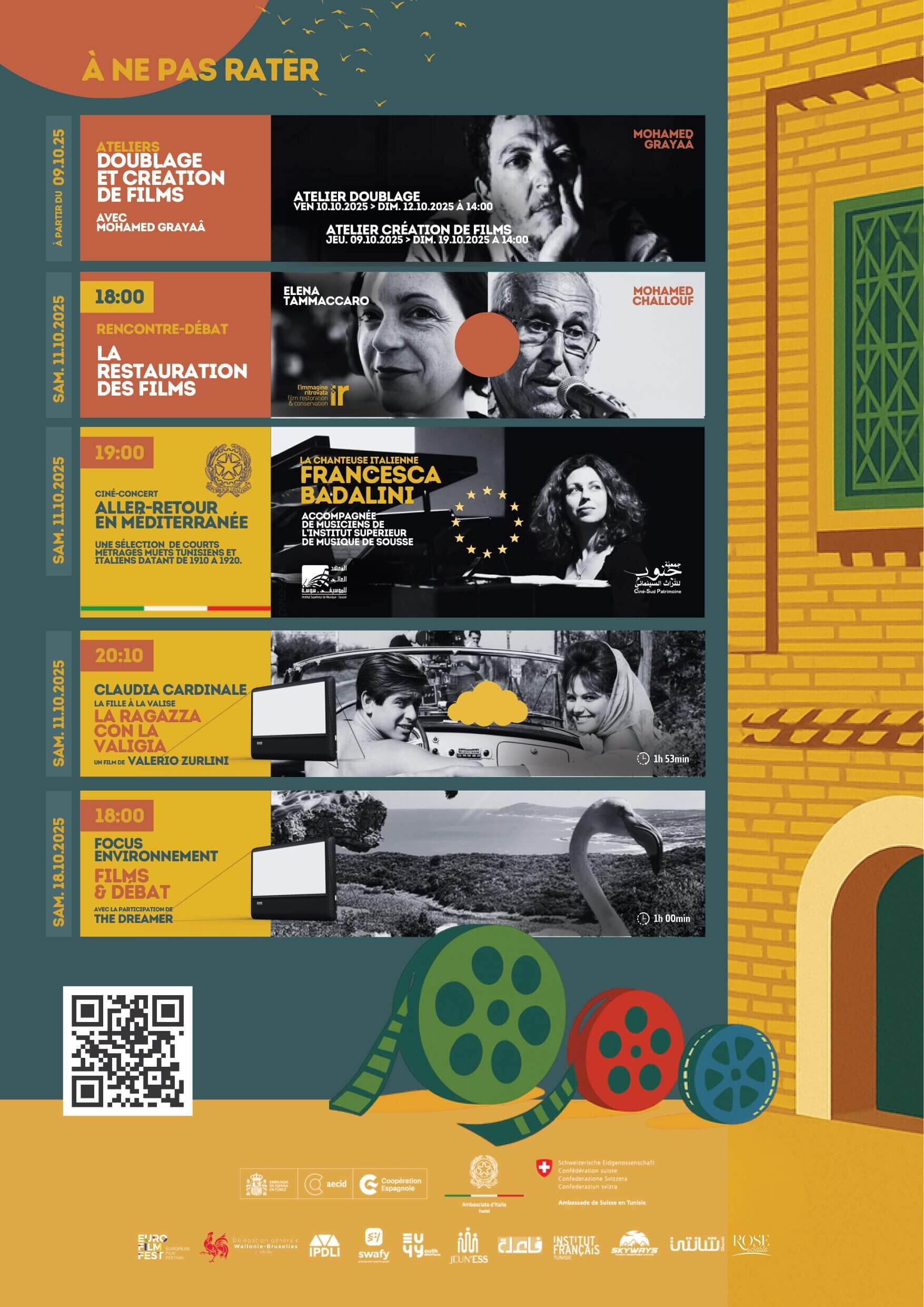 • Un focus sur le cinéma italien, en partenariat avec l’ambassade d’Italie, suivi d’un concert exceptionnel de l’artiste Francesca Badalini, en collaboration avec l’institut supérieur de musique de sousse