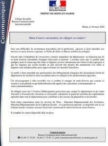 Le préfet de Seine et Marne appelle par le biais de ce communiqué les réfugiés en renfort pour la profession agricole.