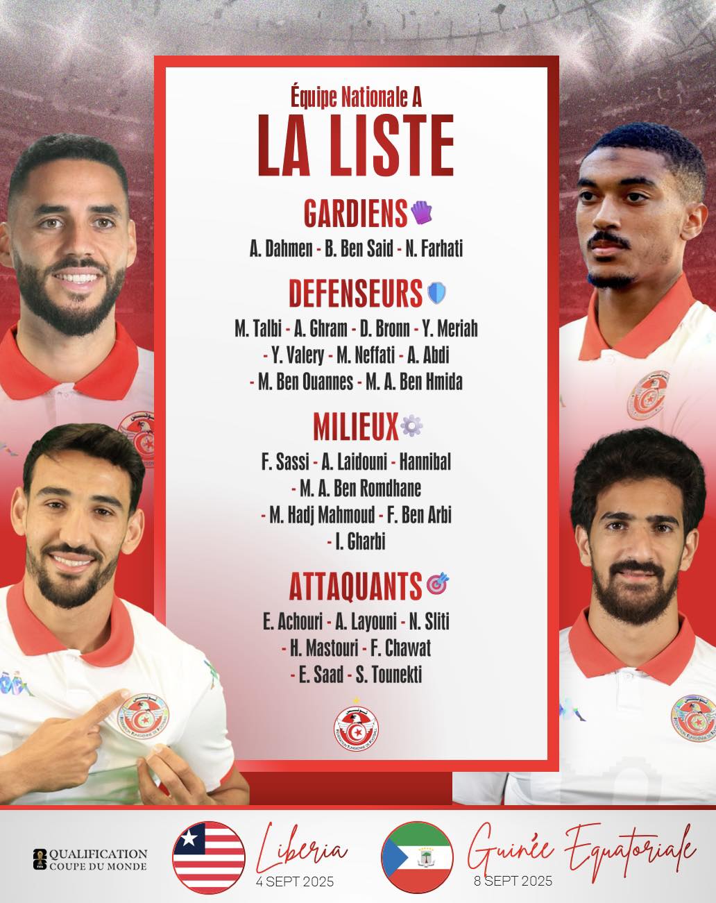 Le sélectionneur de l’équipe nationale tunisienne de football, Sami Trabelsi, a annoncé aujourd’hui la liste des joueurs retenus pour les 7e et 8e journées des éliminatoires de la Coupe du Monde 2026.