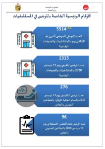 53 patients Covid+ ont été admis, le 11 décembre courant, aux différents établissements sanitaires publics et privés. Ainsi 1315 personnes infectées par le virus sont actuellement hospitalisées (Le nombre total est de 5514 depuis le début de la pandémie). 276 parmi ces patients ont été admis en soins intensifs dont 96 sont sous respirateur artificiel.